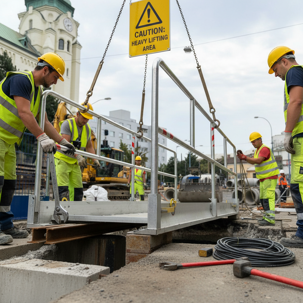 The anti-slip surface ensures safety in all weather conditions, giving you peace of mind during use. The footbridge is designed with integrated toe boards and lifting hooks that facilitate easy loading and handling.