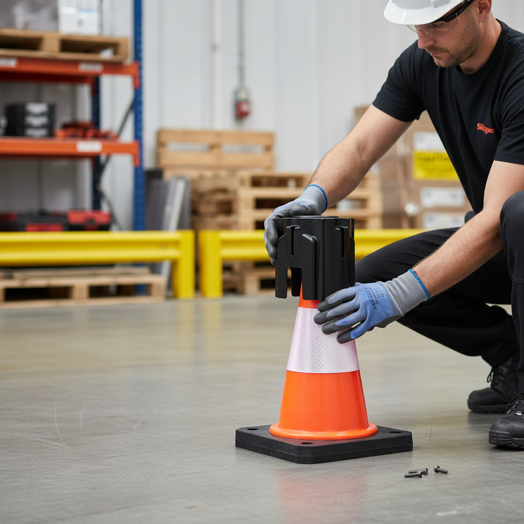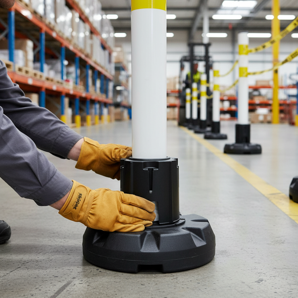 The Premium Post & Base Collar securely fastens to the post by smoothly sliding over the top and settling into place. This creates a sturdy base for connecting recycle bins, safety dispensers, and sanitizer brackets, transforming the post & base system into a comprehensive freestanding safety and recycling station.