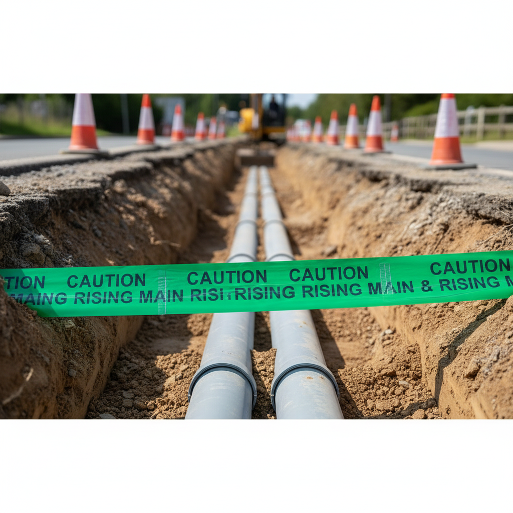 The Premium Detectable Underground Tape is an essential tool for safely identifying underground pipes and services. Made from durable 130-micron LDPE, this tape features high visibility colored plastic mesh and two stainless steel wires, ensuring it can be detected from the surface. It is designed to mark buried services during excavations, effectively preventing accidental damage.