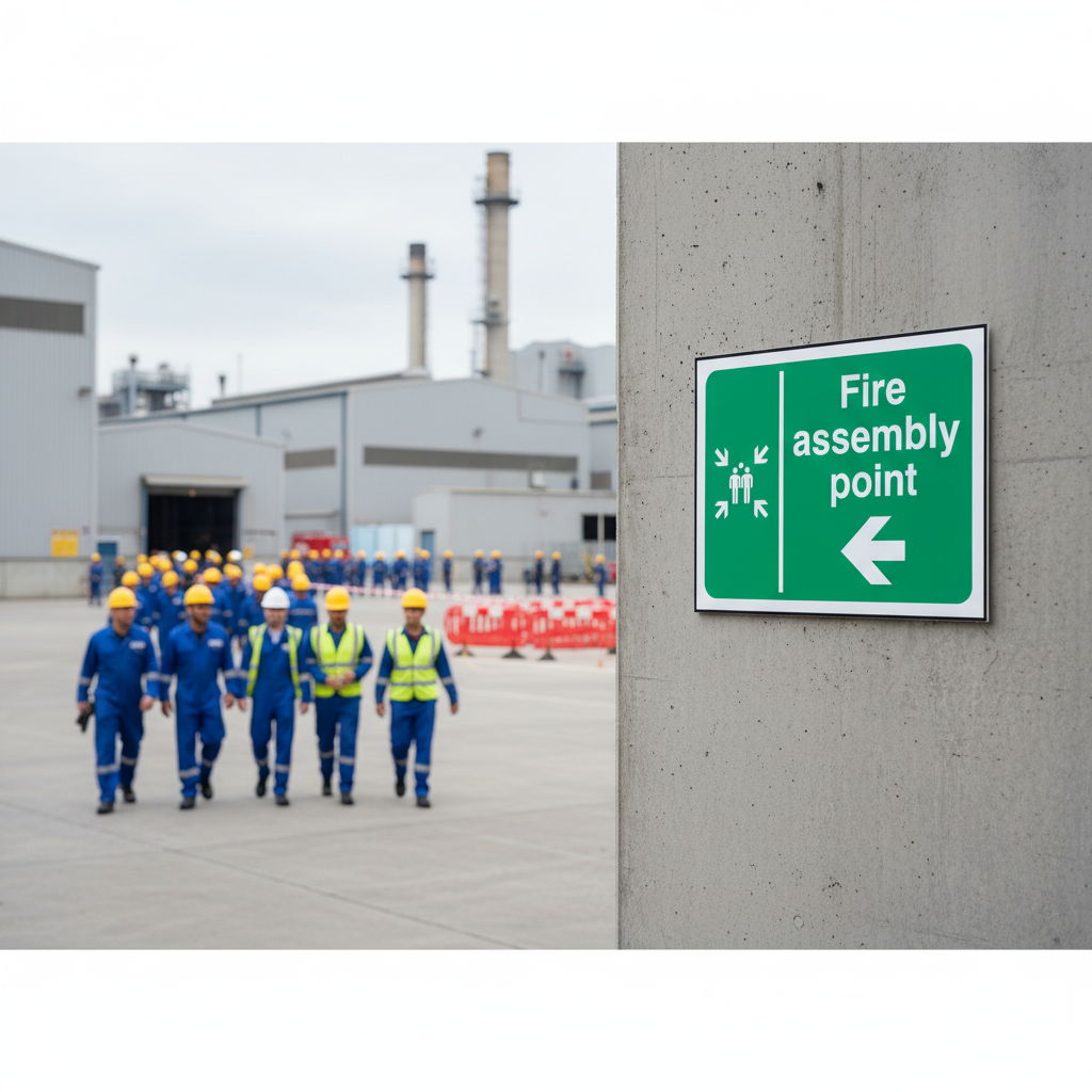 Fire Assembly Point Signs featuring arrows are essential for guiding individuals to designated assembly areas during evacuations. The arrow indicates the direction of the fire assembly point, providing clear and visible guidance in emergency situations.