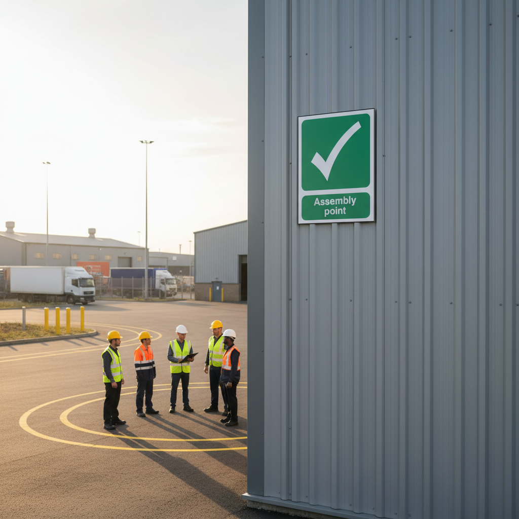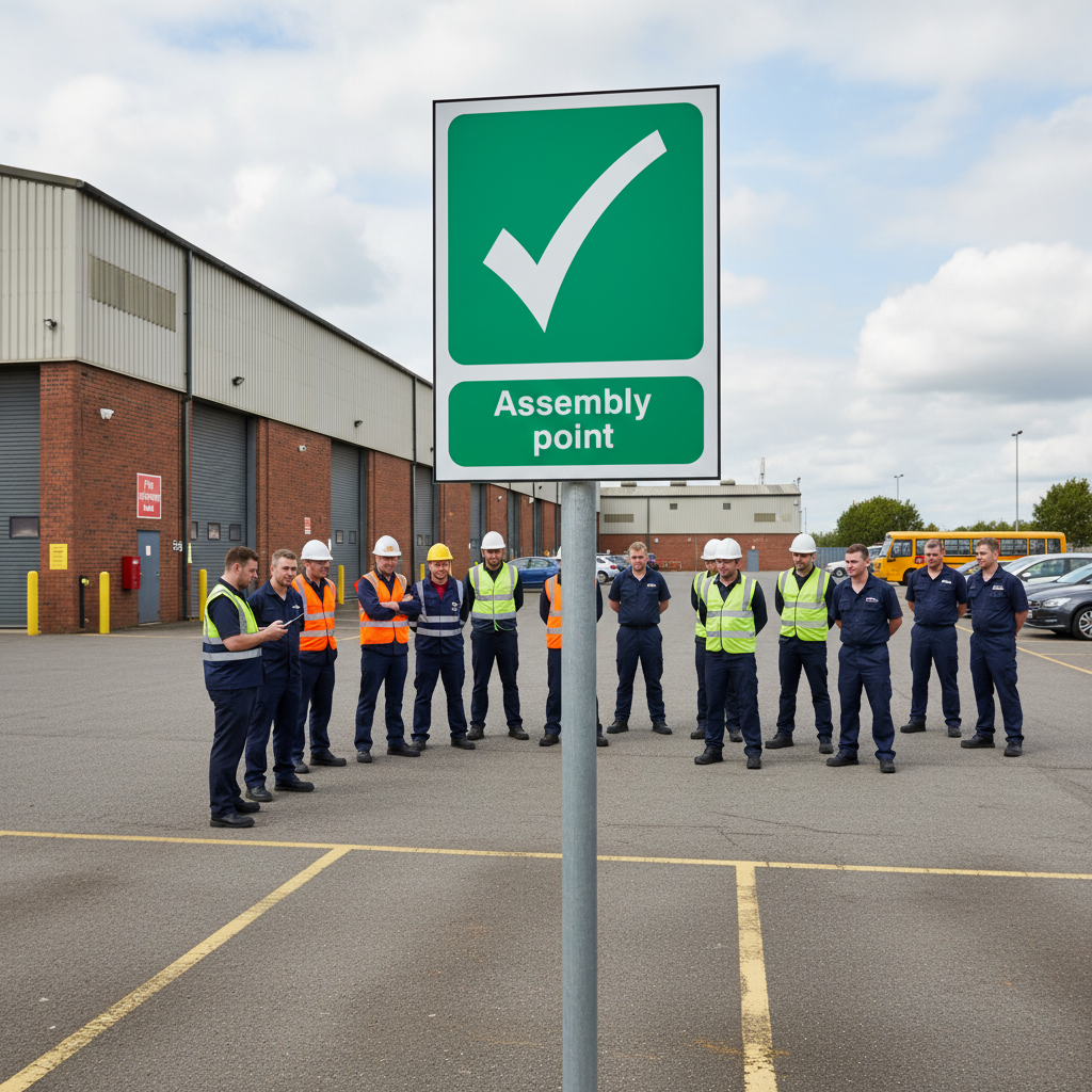 Assembly Point signs are critical for confirming designated assembly points during emergencies. They guide individuals to verified meeting locations, ensuring an organized and safe gathering for accountability.