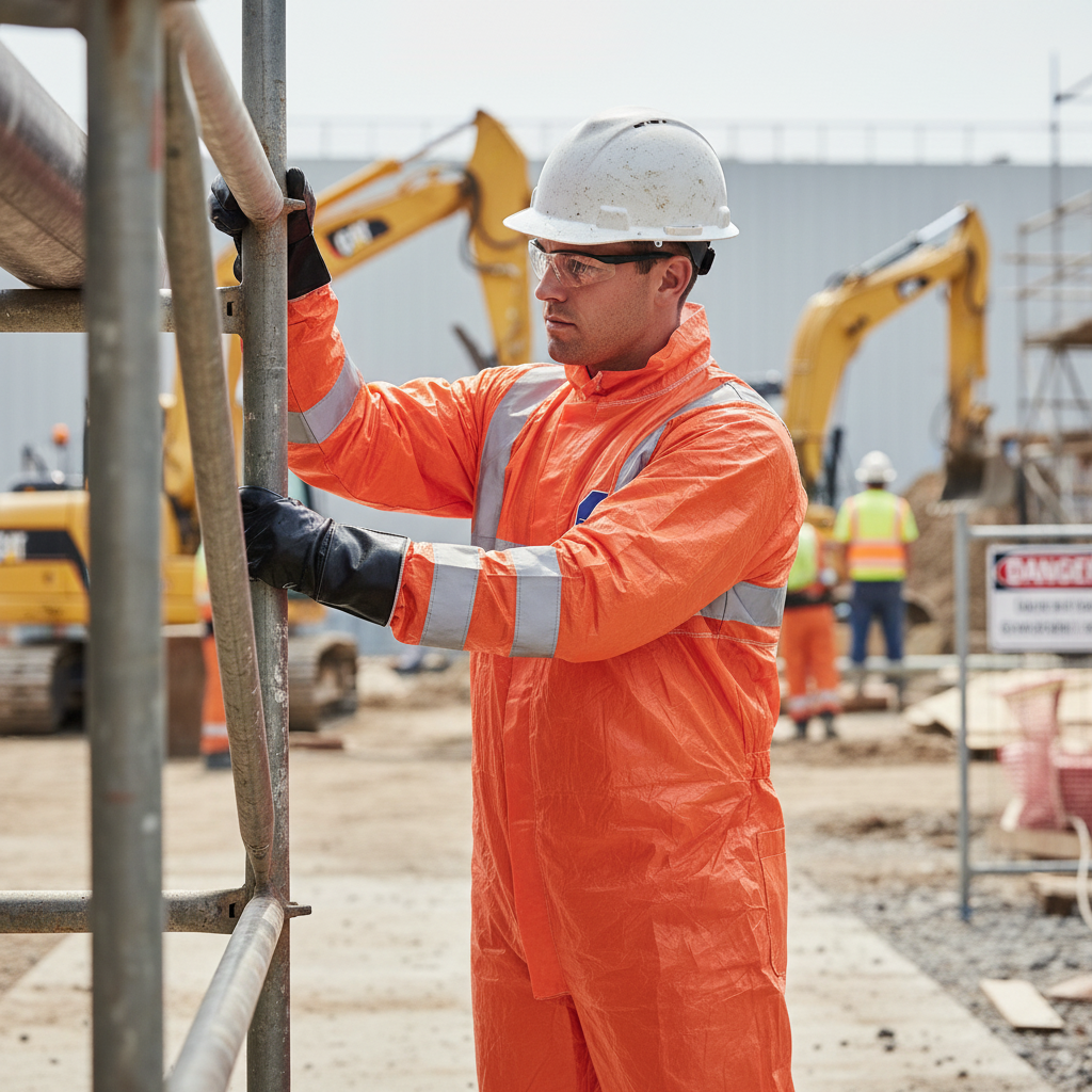 The High-Performance Disposable Collared Coverall in fluorescent orange offers exceptional protection and visibility, meeting Category III protection standards. It is designed for chemical liquid splash protection and particulate protection, adhering to Type 5-B and Type 6-B requirements. The high visibility of this coverall meets Class 3 and GO/RT rail specifications, making it ideal for use in railway, underground, and various construction settings.