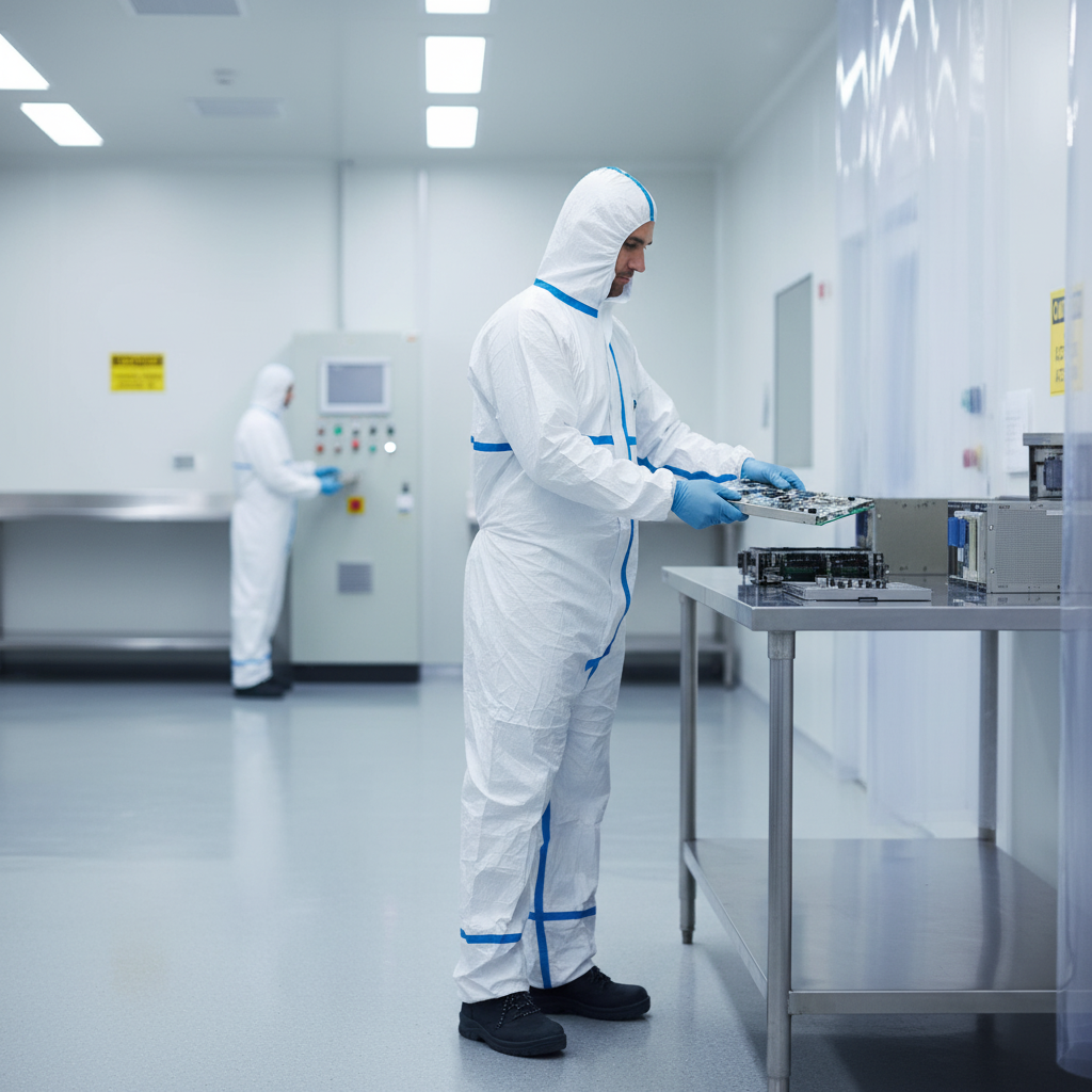 This coverall is ideal for use in pharmaceutical manufacturing, nuclear environments, laboratories, and biohazard situations.