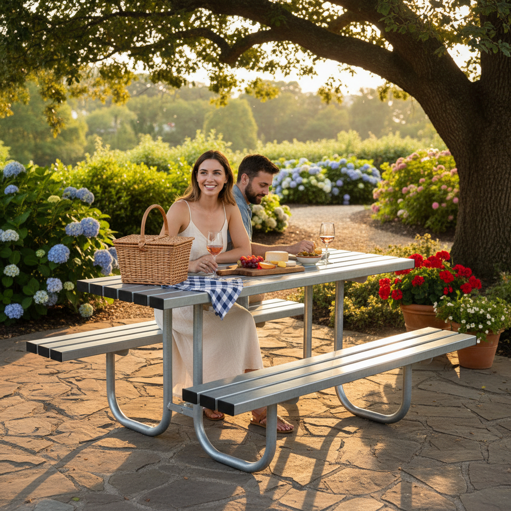 The picnic table is designed for low maintenance, requiring minimal upkeep while providing durability in high-traffic areas.