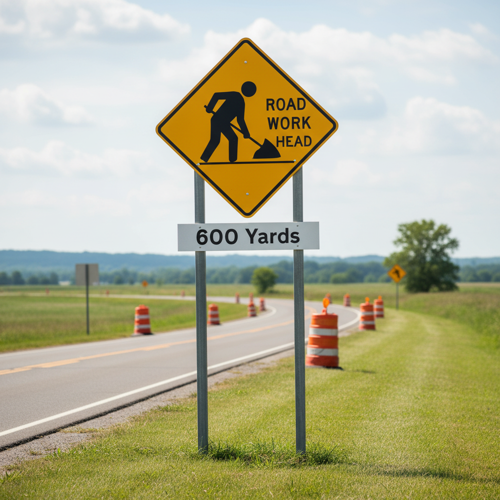 The '600 Yards' supplementary plate is designed for use with road works signage. This plate is essential for indicating that road works have concluded, ensuring clear communication to drivers.