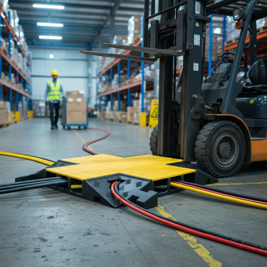 The Heavy Duty 3-Channel Cable Ramp is an essential tool for protecting important cables and hoses in various settings such as events, factories, warehouses, and public spaces. Designed for strength and functionality, this cable ramp not only keeps your cables safe but also acts as a speed bump, capable of withstanding the weight of vehicles.
