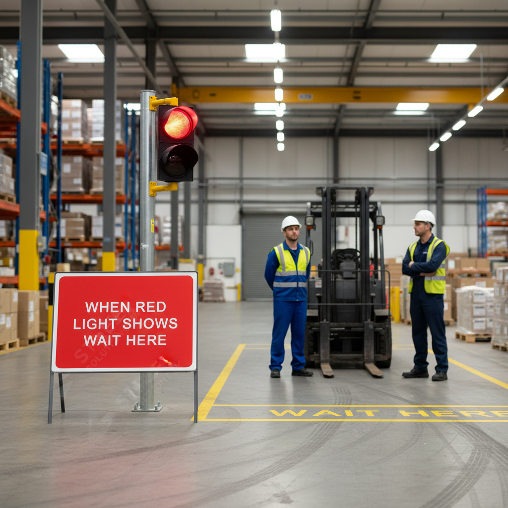 This heavy duty metal sign, designed for traffic management, clearly indicates that vehicles should wait when the red light is showing. Commonly seen on roads, this sign ensures safety and compliance in traffic flow.