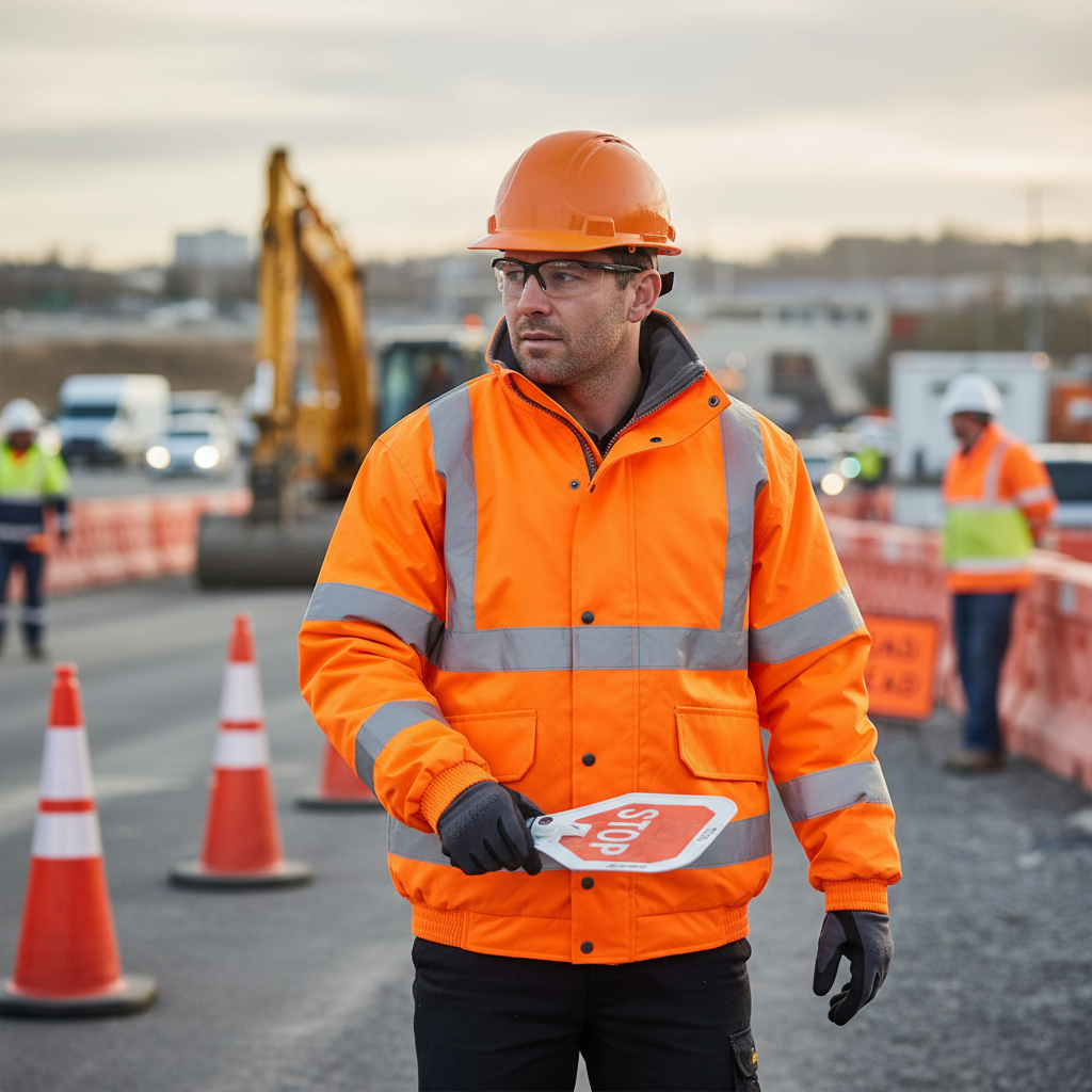 Enhance your visibility and stay warm in challenging conditions with our High-Visibility Fleece Lined Bomber Jacket in vibrant orange. Constructed with a heavyweight Polyester Oxford outer shell featuring a durable PU coating, this jacket is designed for both comfort and weather resistance.