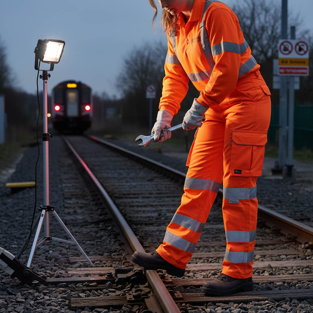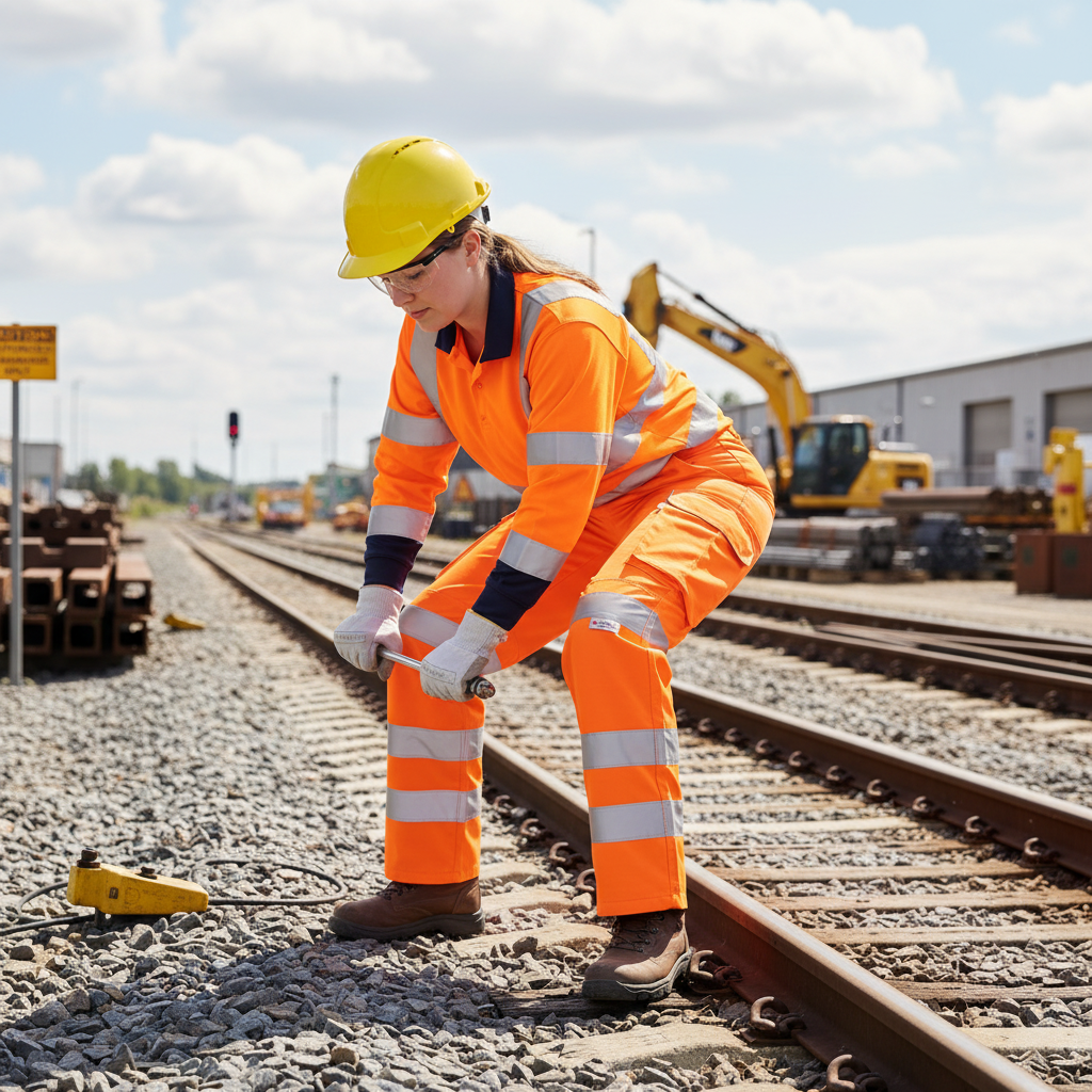 Introducing our High-Visibility Women's Rail Spec Trousers in bright orange, designed for safety and comfort in demanding working environments. Made from high-quality 280gsm 80-20 polyester cotton, these trousers are not only durable but also soft and comfortable to wear throughout the day.