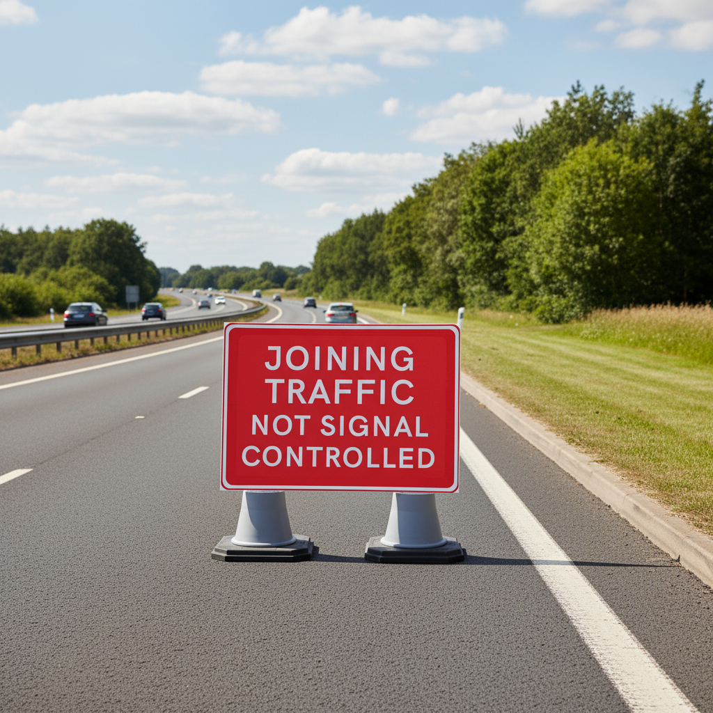 The Heavy Duty Joining Traffic Not Signal Controlled Cone Sign is designed to enhance road safety by alerting motorists of potential traffic from side roads that are not controlled by traffic signals. This sign measures 1050mm in width and 750mm in height, making it highly visible for drivers.