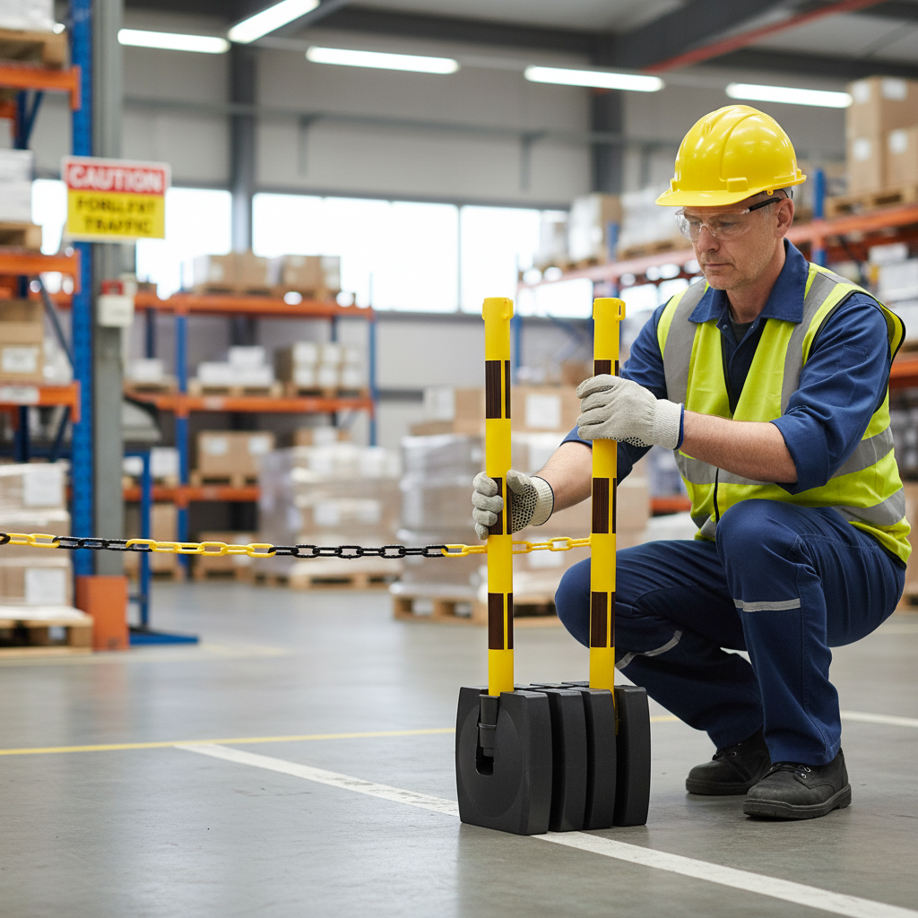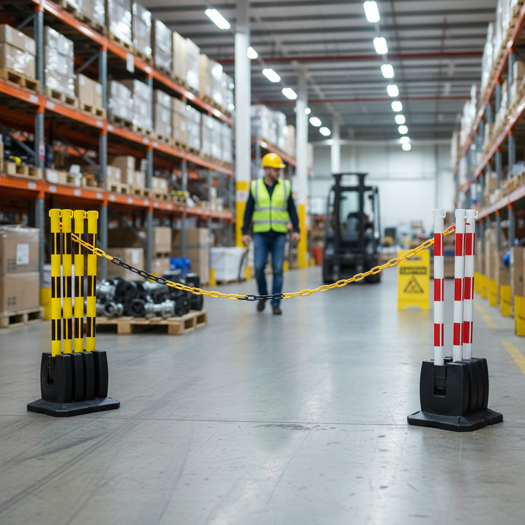 Each kit comprises four posts with high-visibility colors and folding bases, along with 10 meters of durable plastic chain available in two color combinations: Red & White or Yellow & Black. The folding bases are designed for easy storage and quick deployment in all weather conditions. Weighing 4.5kg, the low center of gravity ensures stability and prevents the posts from toppling over.