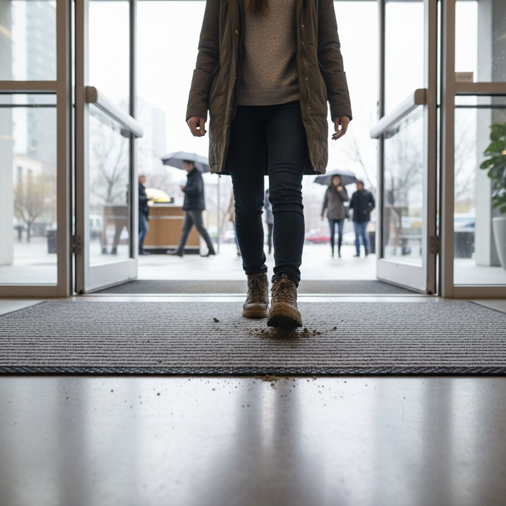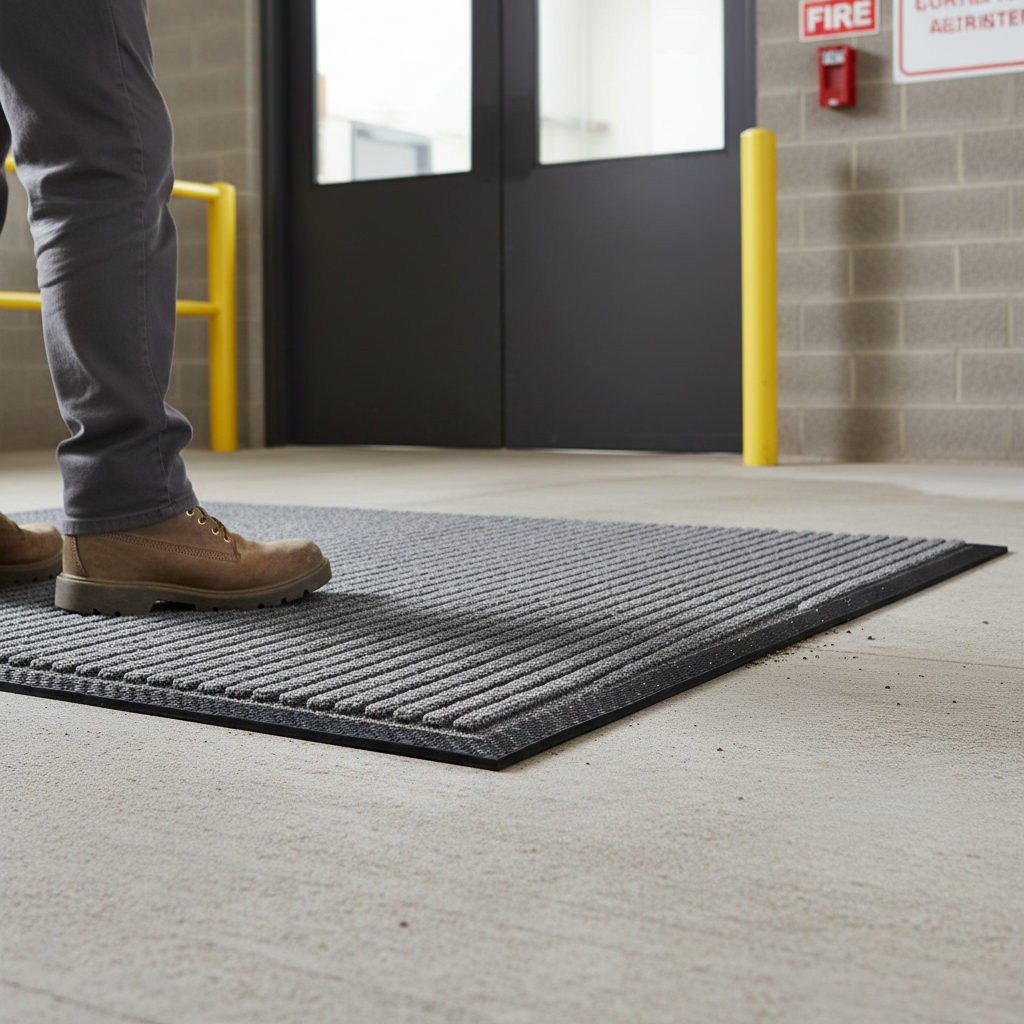 This premium ribbed entrance door mat is designed for effective moisture retention and dirt removal in indoor environments. Its unique double rib pattern allows for superior brushing and wiping action, making it ideal for medium to heavy traffic areas, such as shops, schools, and offices.
