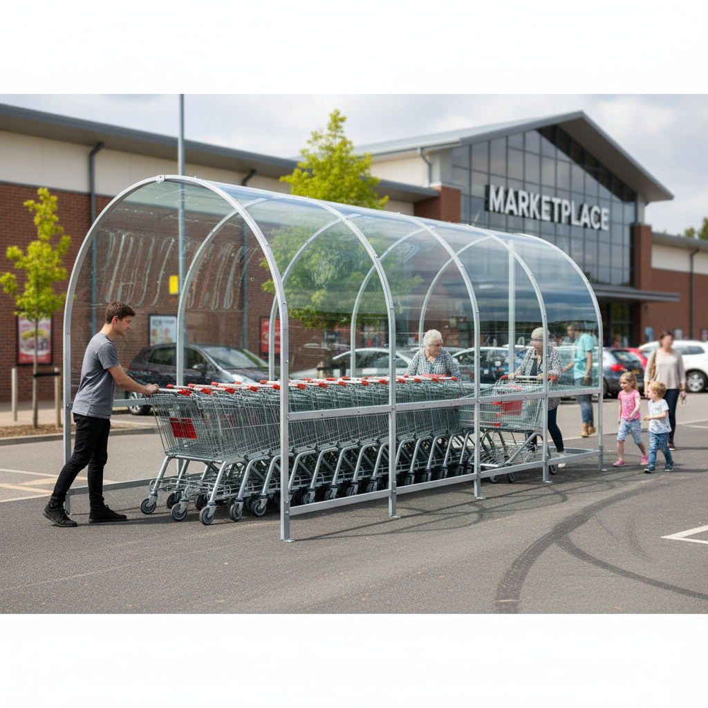 The Heavy Duty Single Bay Trolley Shelter is designed with a sleek modular look to fit in any standard car parking space, making it perfect for retail establishments. This shelter is built to store up to 36 standard trolleys and can be extended with additional bays for your convenience.