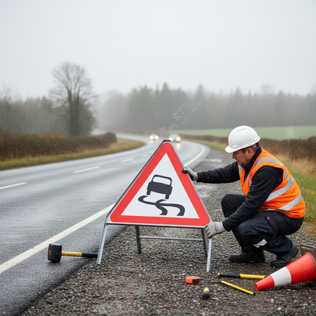 The sign alerts road users about potentially slippery road conditions, improving safety.