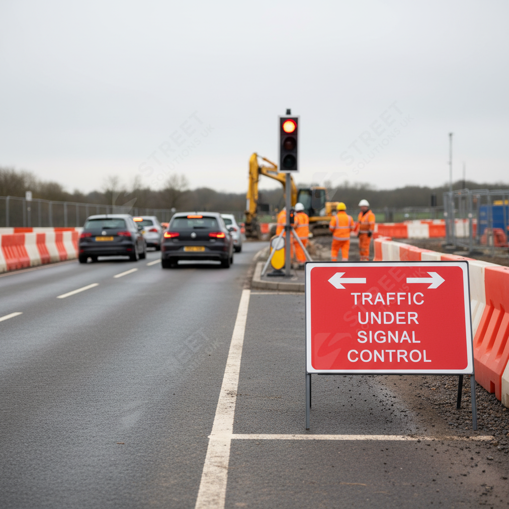 This Premium Traffic Under Signal Control Sign is a metal road sign commonly used to indicate that traffic will be controlled by signals. Designed for high visibility, this sign features a retroreflective surface that ensures it can be easily seen in low-light conditions.