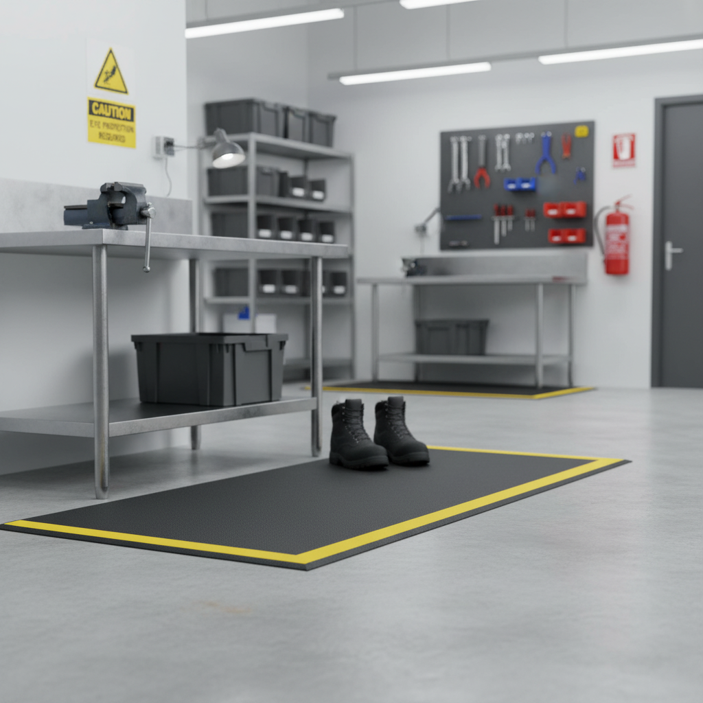 This Premium Anti-Fatigue Mat is ideal for light-duty industrial use, designed to provide comfort and reduce fatigue during long periods of standing. Available with yellow safety borders or in a sleek plain black, this mat enhances safety while improving traction and comfort.