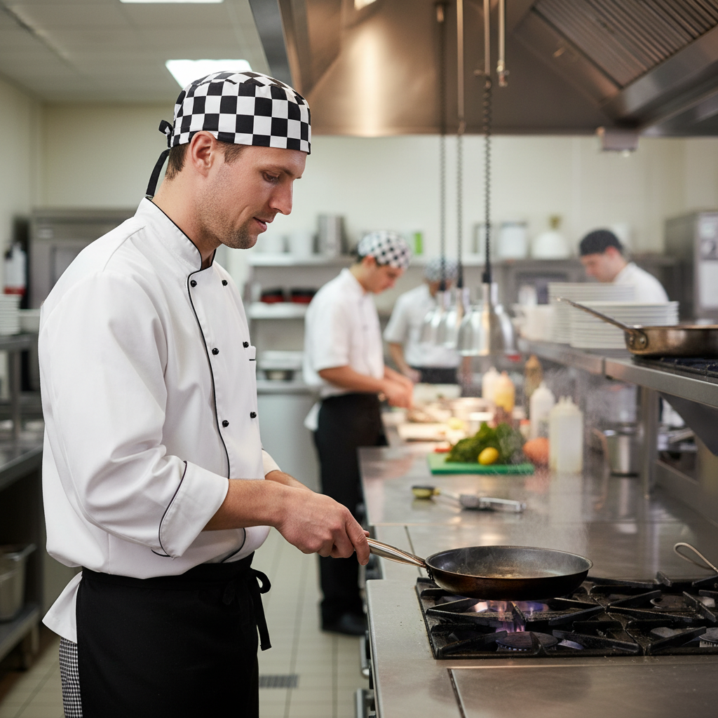 The cotton material provides breathability, keeping the head cool and dry during long hours of cooking and food preparation. Designed for durability and ease of maintenance, this skull cap is a staple in culinary attire, offering a polished look while maintaining hygiene standards.