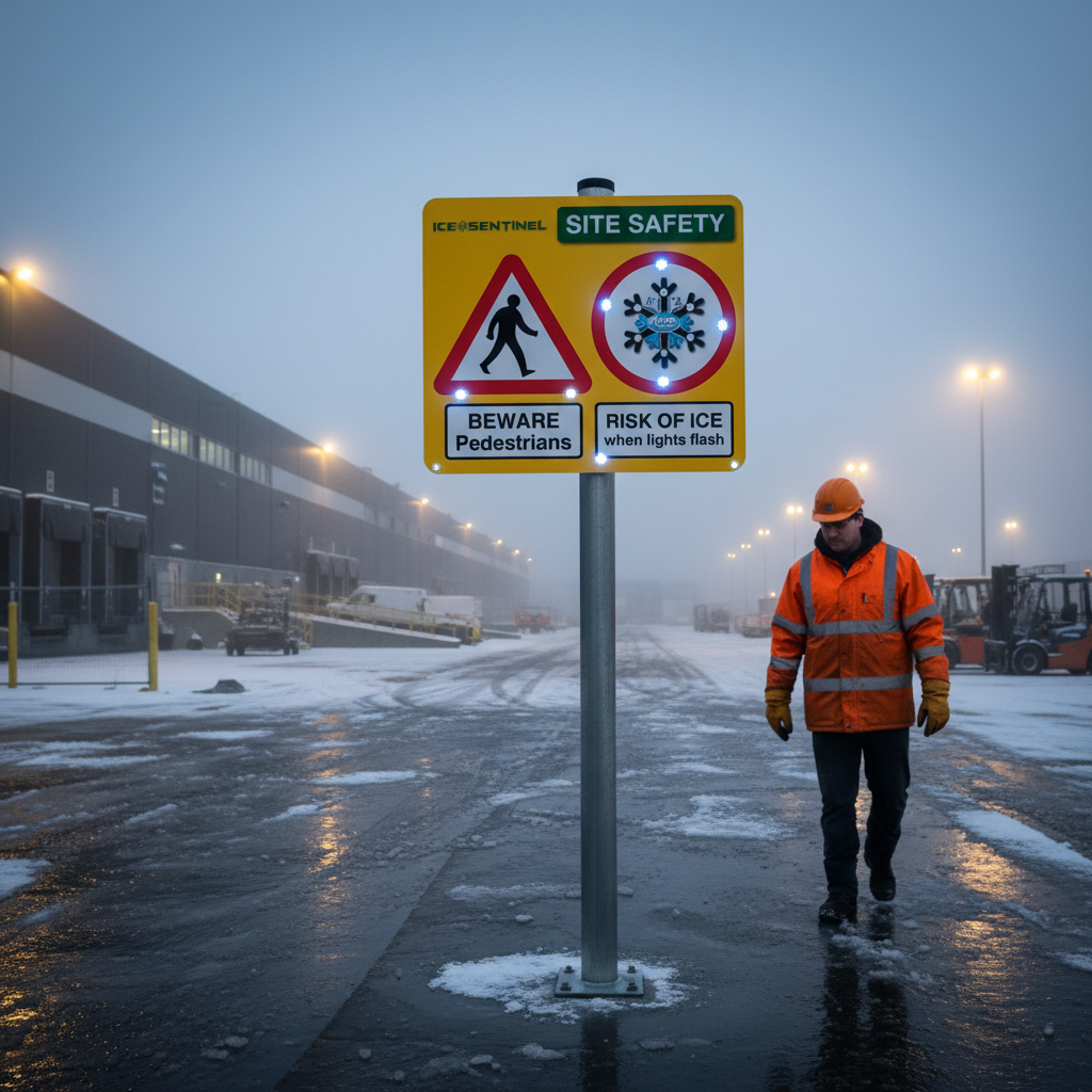 - Offers a dual-purpose warning, incorporating an on-site safety message along with a risk of ice warning message.