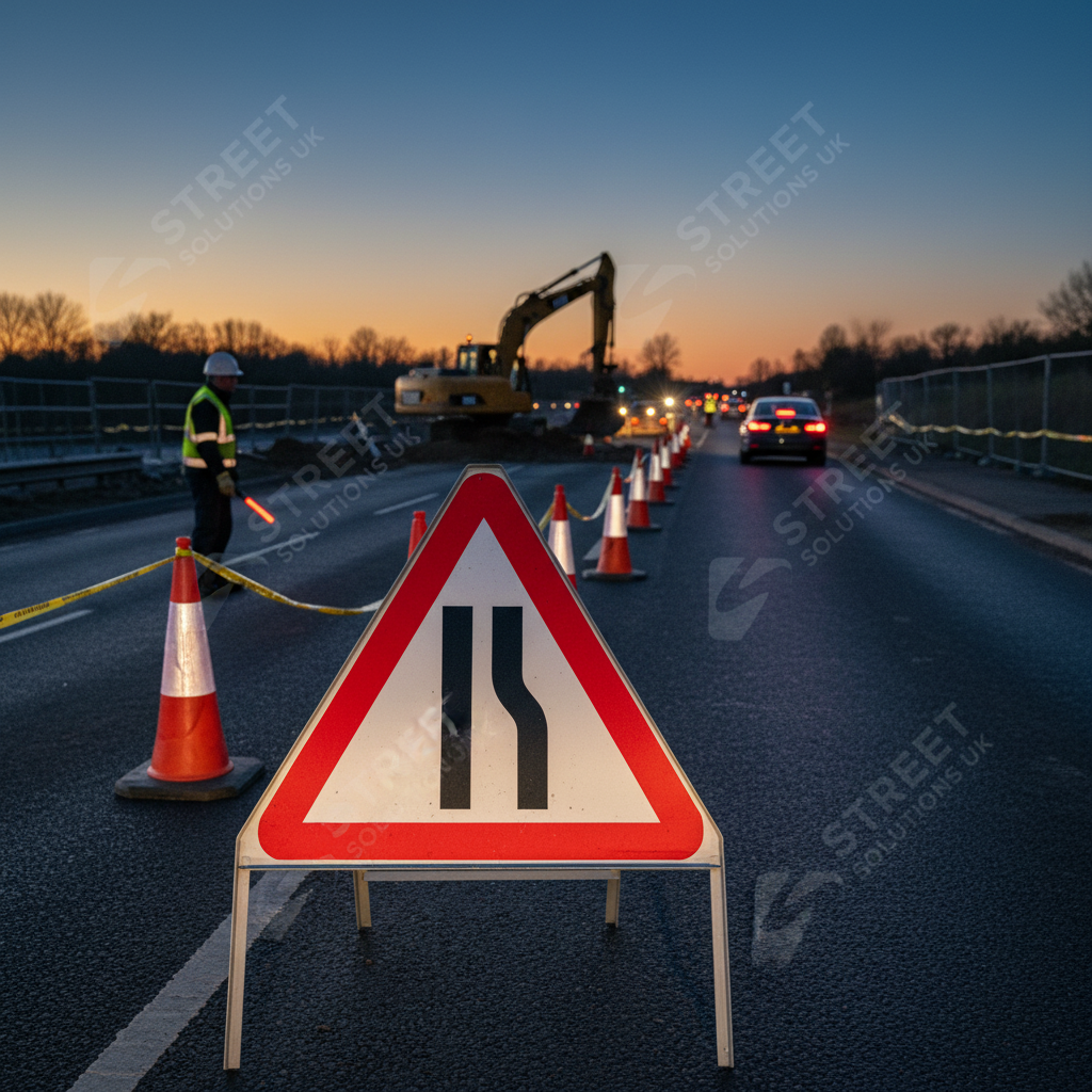 - Enhances road safety by clearly warning drivers about narrowing roads.