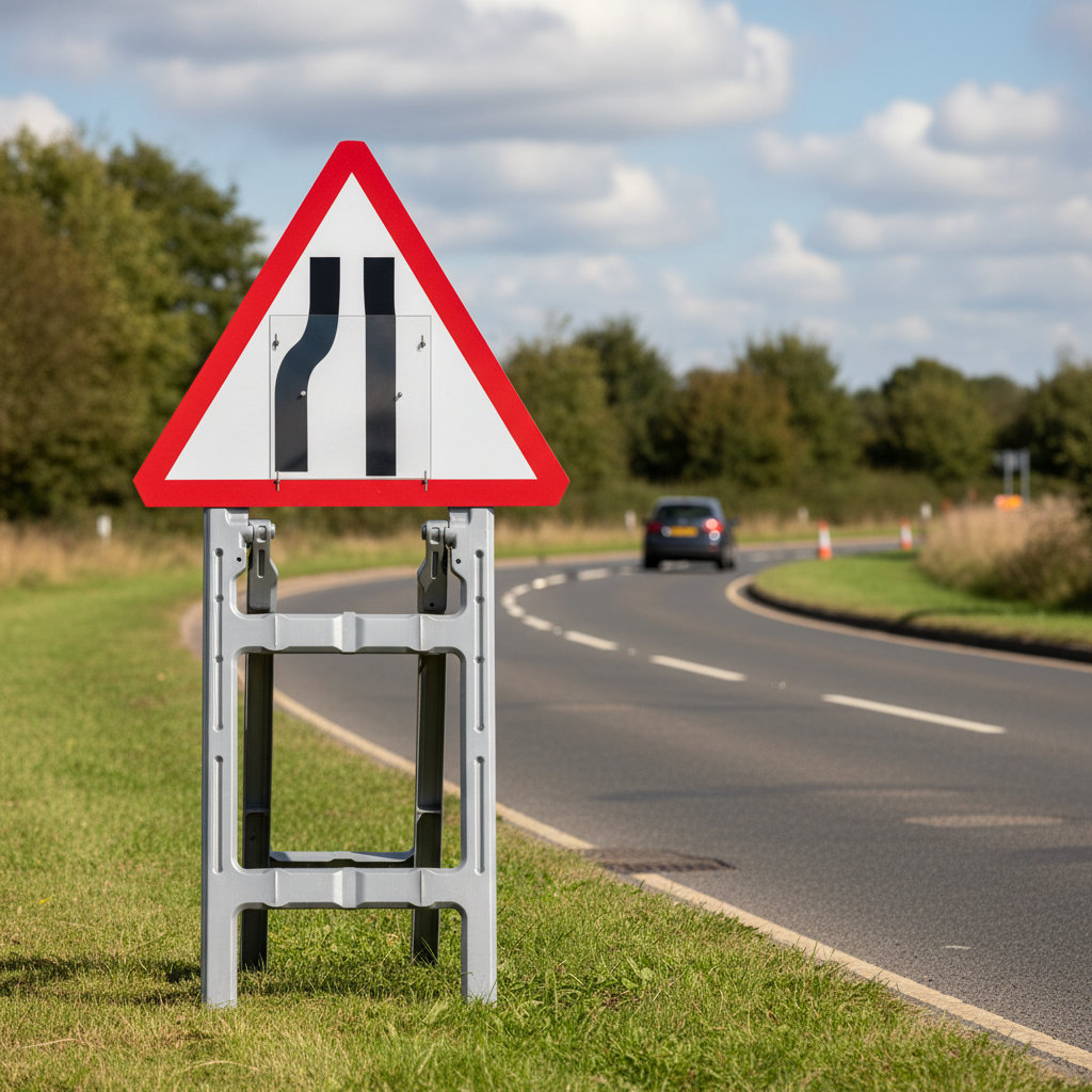 The 'Road Narrows Right/Left' quick fit sign face is designed for use with quick fit frames, providing a versatile solution for traffic management. This sign features an adjustable blanking plate, allowing it to be easily set to display either or both sides of the road as narrowing. This innovative design not only saves space on vehicles but also reduces the overall weight load, making it a practical choice for temporary road signage.