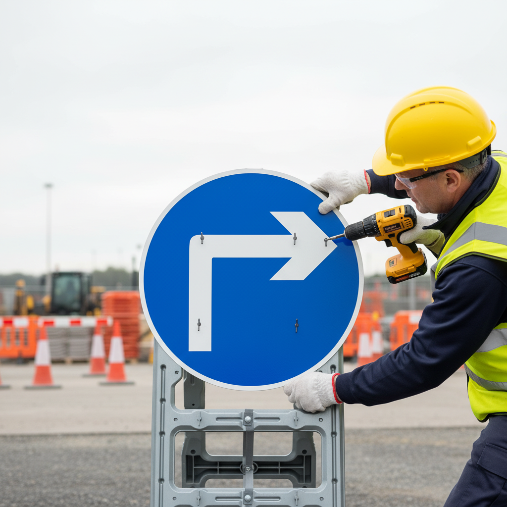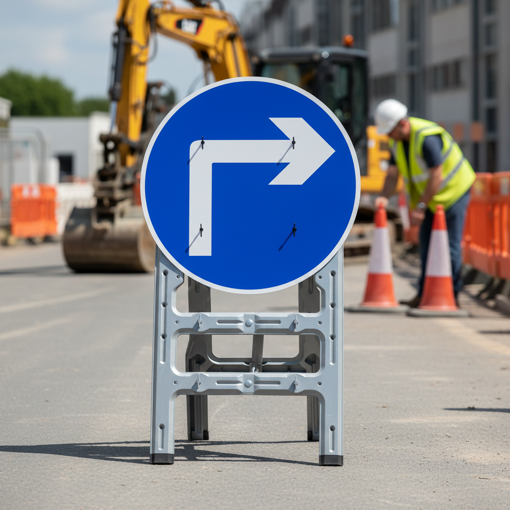 Introducing the Quick-Fit Sign Face indicating 'Turn Right Ahead', ideal for use in temporary roadwork situations where road layouts have changed. This sign is essential for guiding drivers safely through altered routes.