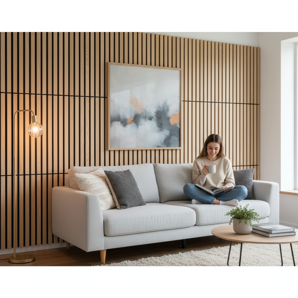 This pack of four premium light oak wall panels (600 × 600 mm each) features a classic square slatted design. Each panel is backed with FSC-certified MDF and acoustic felt, providing both style and functionality for your space.
