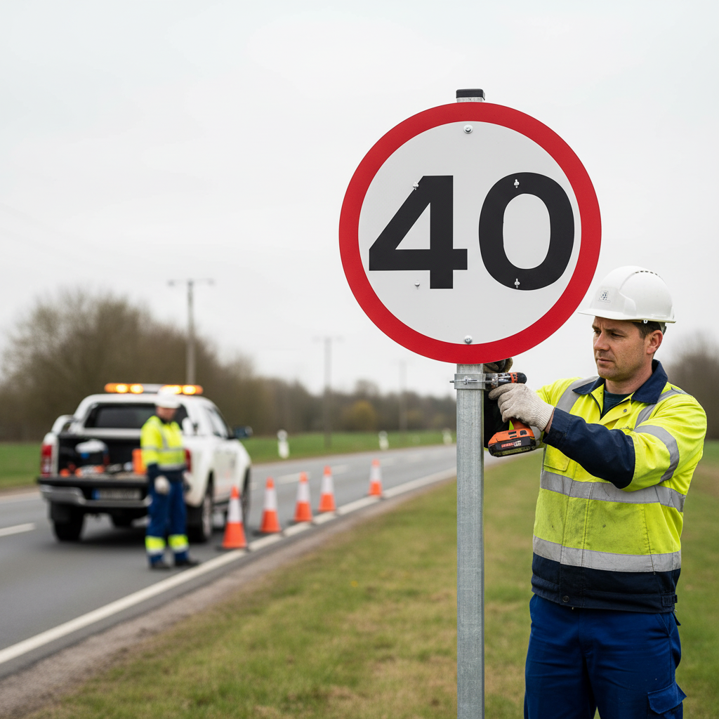 The temporary quick-fit sign face indicating a 40mph speed limit is frequently seen in roadworks on dual carriageways. This sign is designed to ensure public and worker safety during lane closures and ongoing construction activities. Easily mounted on compatible quick-fit frames, this sign face is an essential addition for any traffic management plan.