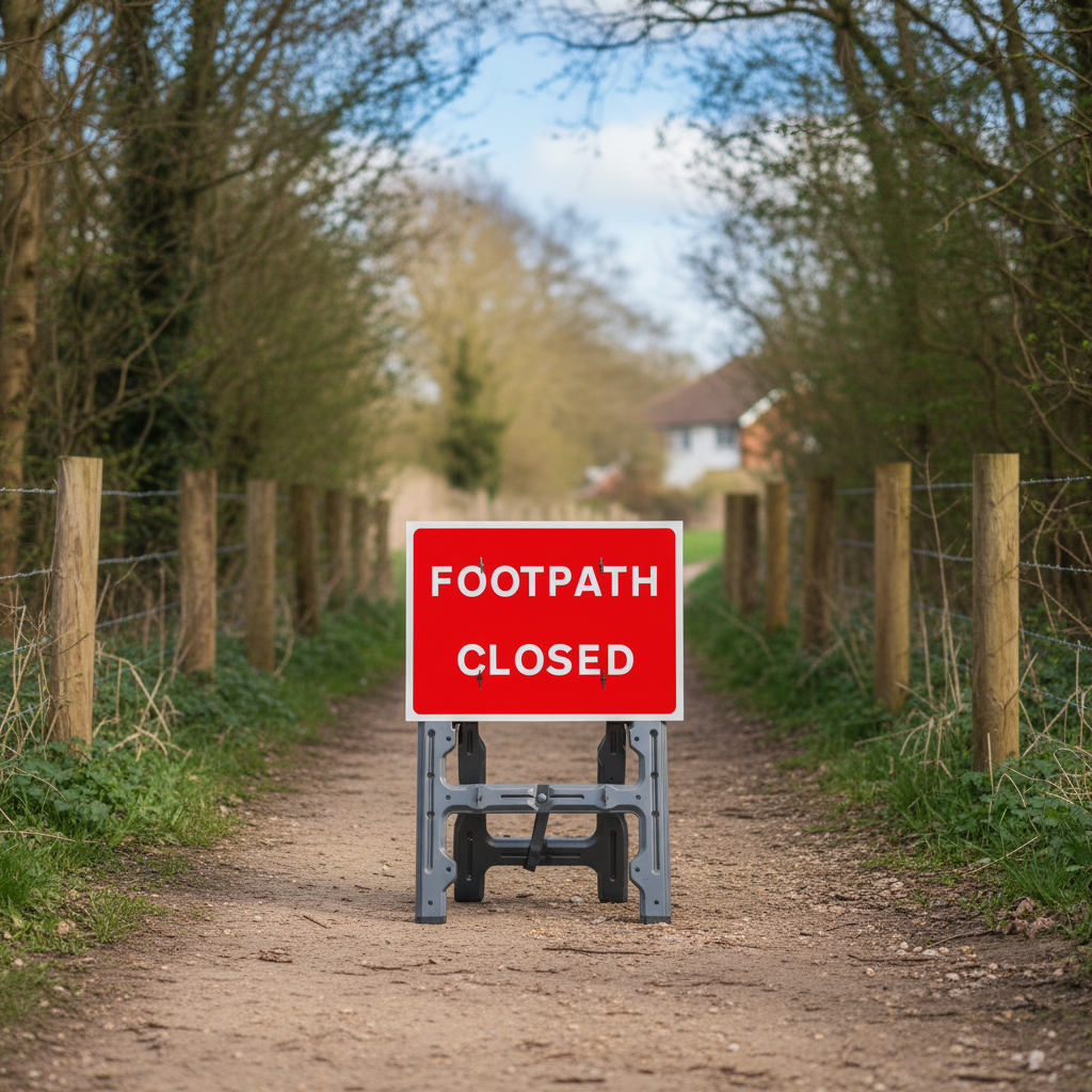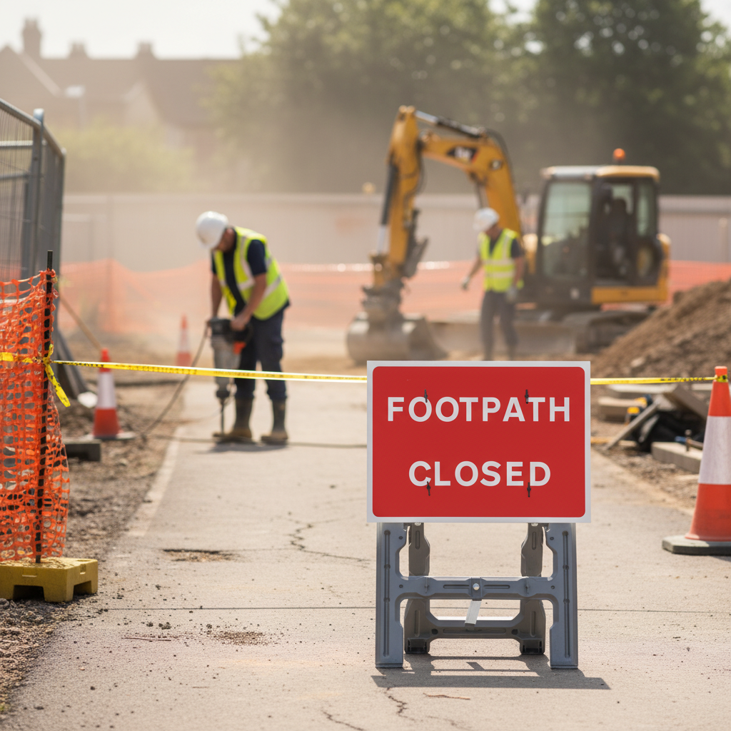 The 'Footpath Closed' quick fit sign provides a clear indication of a closed footpath, primarily aimed at pedestrians and cyclists. It is commonly found on footpaths and pedestrian areas, ensuring safety and compliance with regulations.