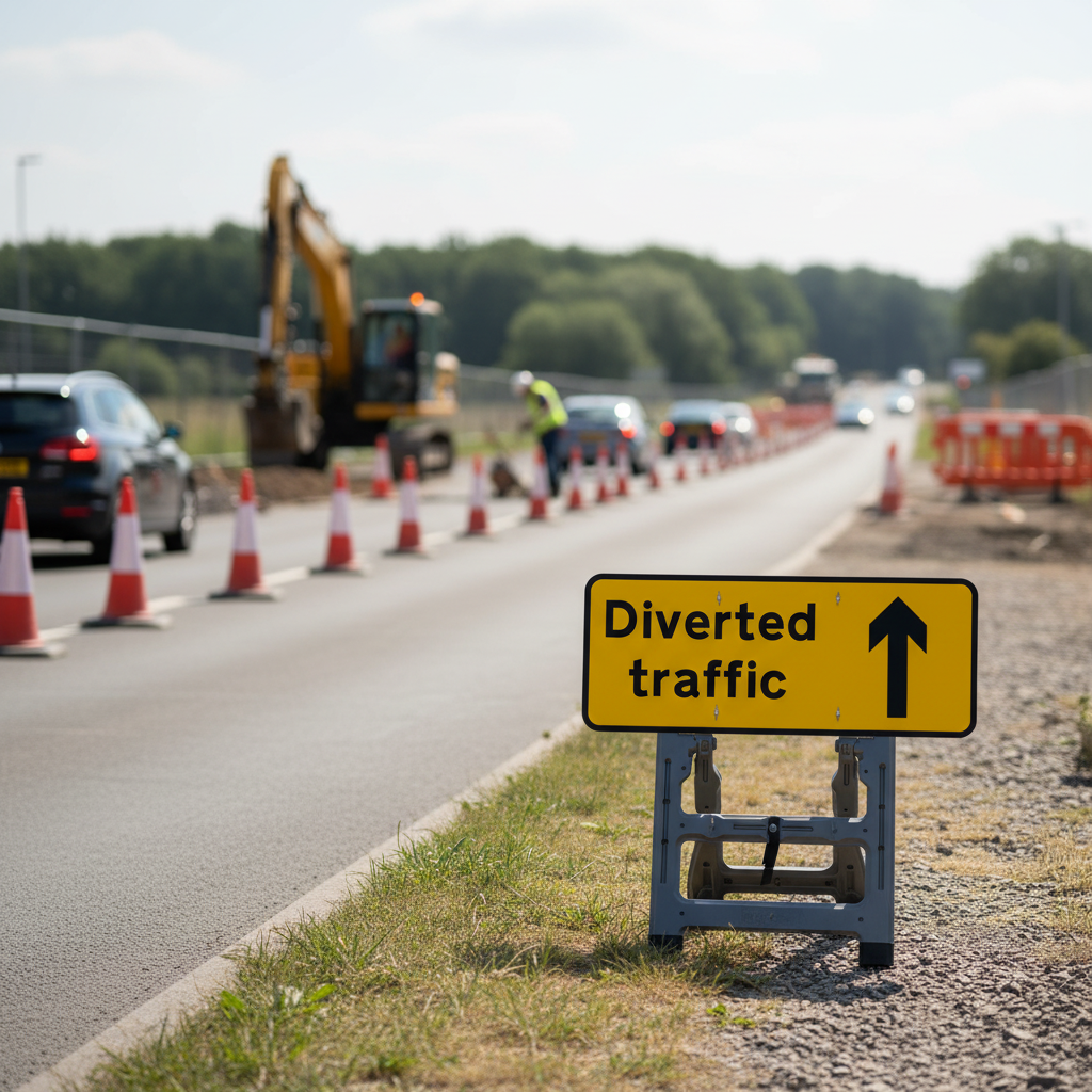 The diverted traffic sign guides road users on a diversion route to reach their intended destination. This particular sign features an upward arrow indicating that the diversion continues straight ahead. Various formats of this sign exist, with directional arrows pointing in different directions, including a rotating arrow variant.