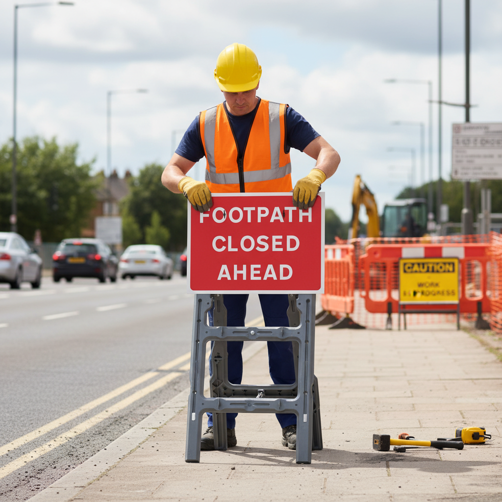 The 'Footpath Closed Ahead' quick fit sign provides early notice to pedestrians about a closed footpath. This sign is an essential addition for ensuring safety around temporary closures and is typically used alongside other safety signage.